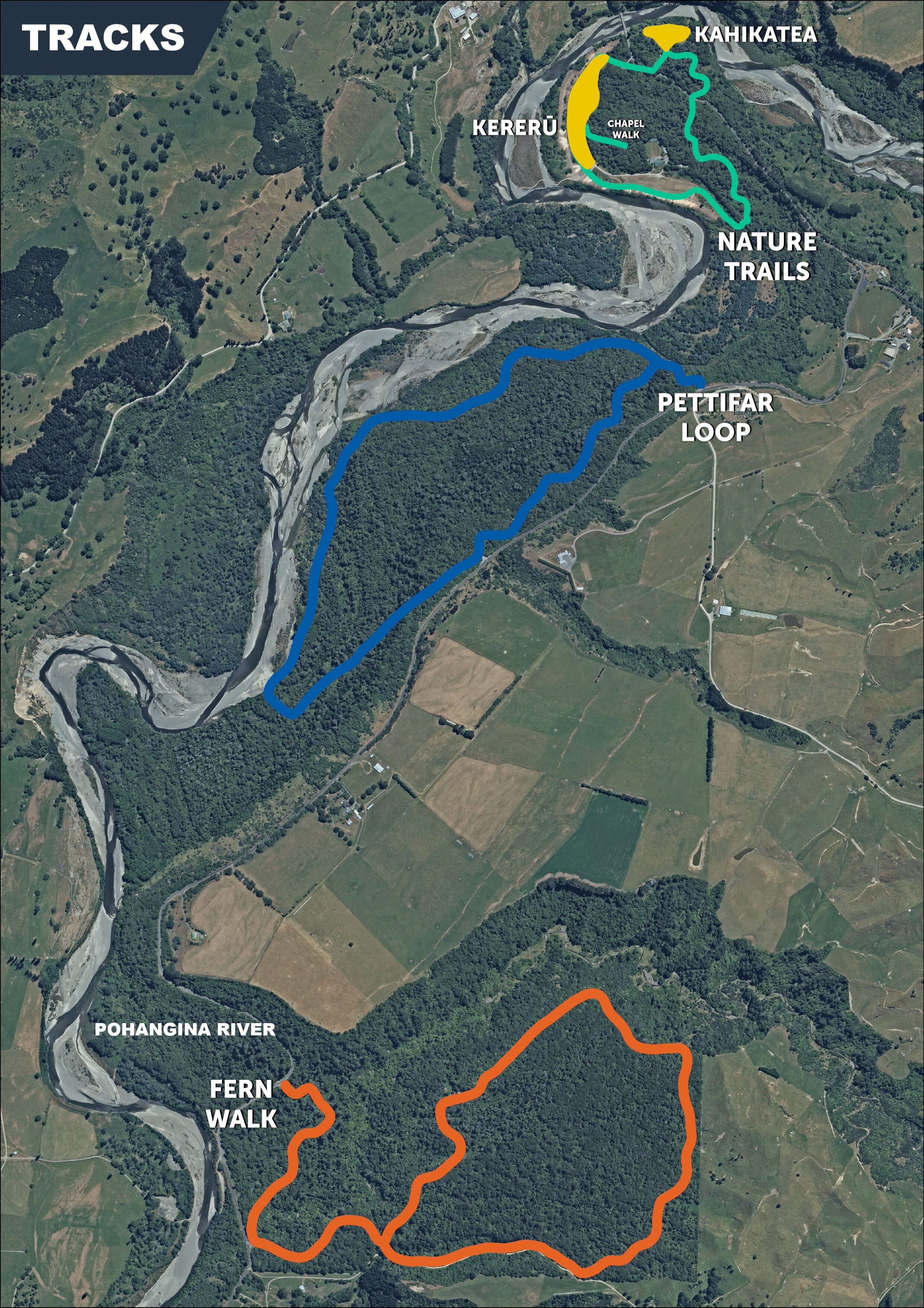 Approximately four minutes’ drive from the camping ground, the Pettifar Tracks lead you down a series of terraces to the Pohangina River. The walk makes use of the Old Coach Road, a section of the original horse and cart track along the Pohangina Valley.